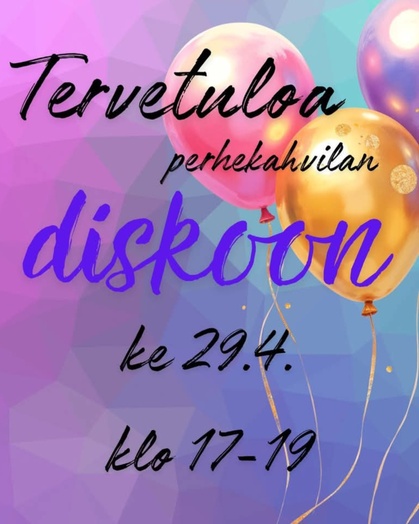 MLL Ylöjärven perhekahvilassa laitetaan jalalla koreasti vappudiscon merkeissä. Tervetuloa koko perheen voimin! Perhekahvila pidetään Virhriälässä osoitteessa Mikkolantie 10 A.