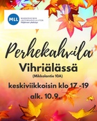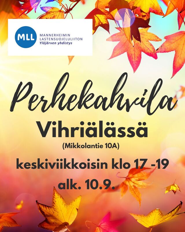 Tervetuloa perhekahvilaan! Perhekahvilat ovat maksuttomia matalan kynnyksen tapaamispaikkoja, jonne voi saapua oman aikataulun mukaan. Pientä iltapalaa tarjolla. Ei ennakkoilmoittautumista. Nähdään tunnelmallisessa Vihriälässä! --- Welcome to MLL family café! Family cafés are free low-threshold meeting places where you can come and go according to your own schedule. A light snack will be provided. No advance registration is required. See you in the cozy Vihriälä!